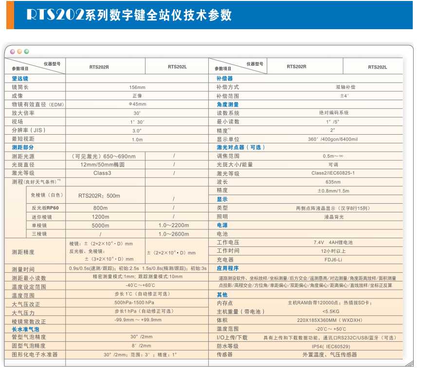 RTS202L系列全中文數(shù)字鍵全站儀,采用全新設(shè)計的支架,在內(nèi)部結(jié)構(gòu)上進行了全面的優(yōu)化設(shè)計。儀器所有空隙處都增加橡膠墊,使得儀器防水防塵等級達到IP66。內(nèi)置大容量內(nèi)存和各種應(yīng)用測量程序,功能強大、性能穩(wěn)定、使用方便。適用于建筑放樣、道路放樣、地形地籍測量及控制點測設(shè)等測量工作。